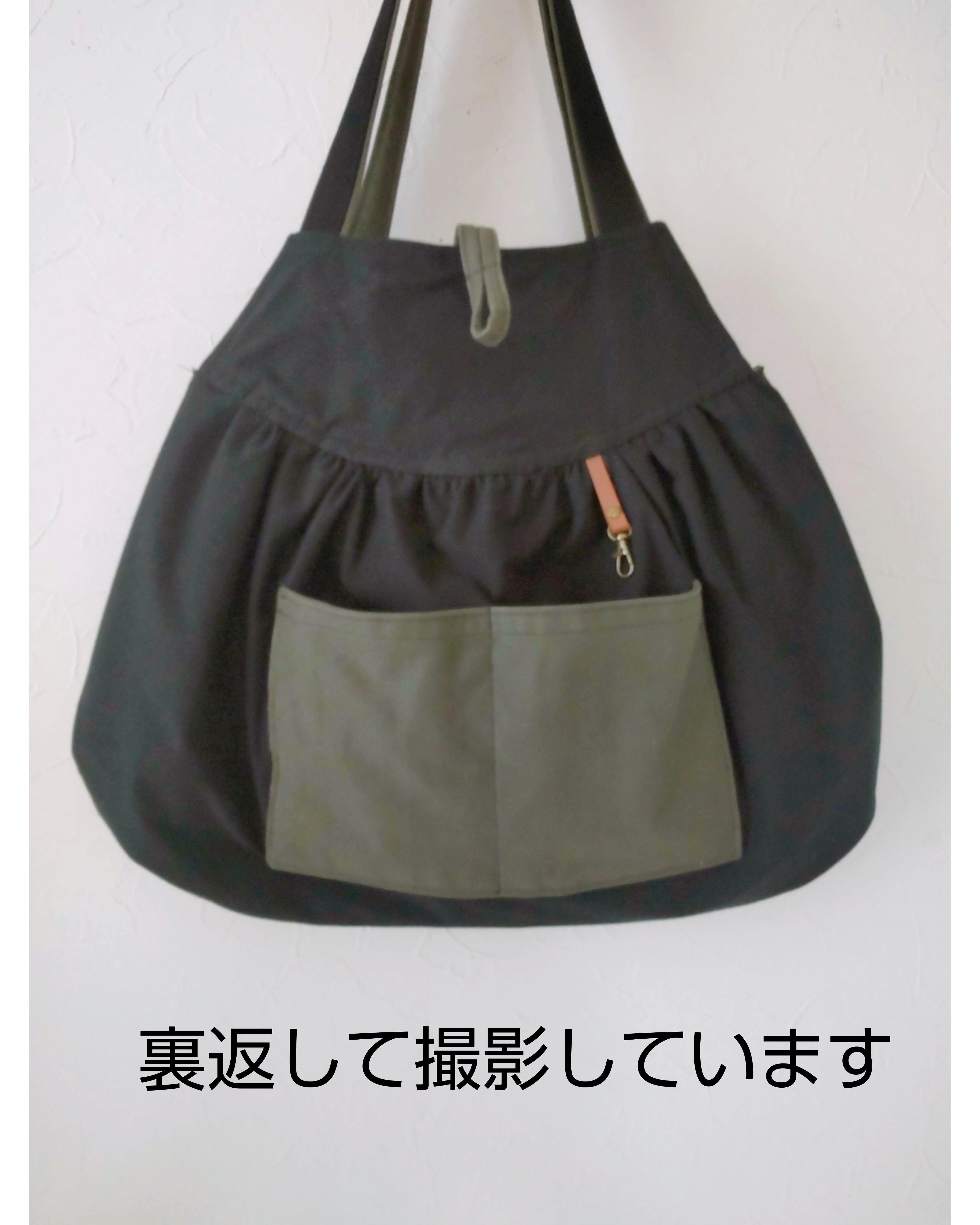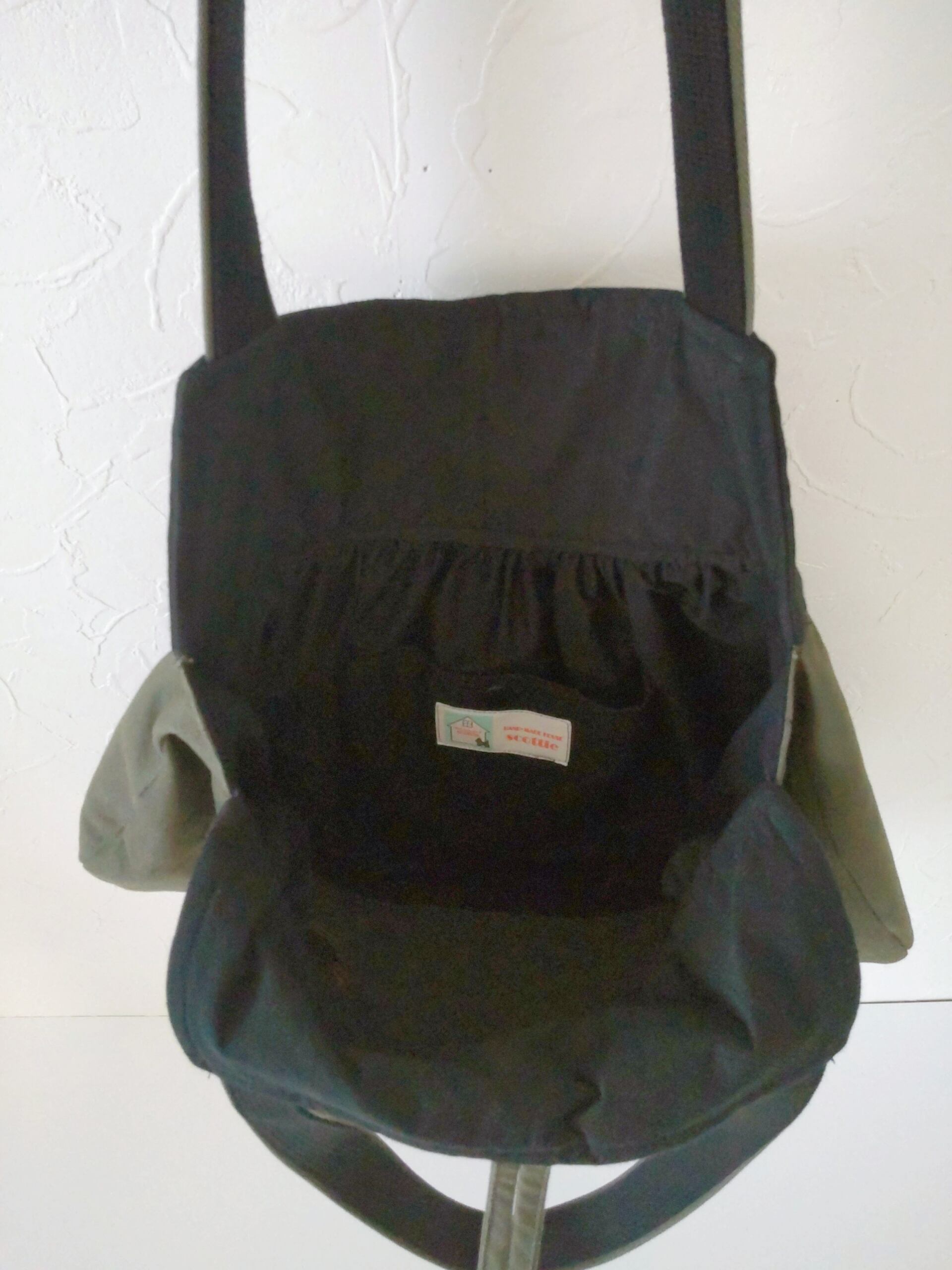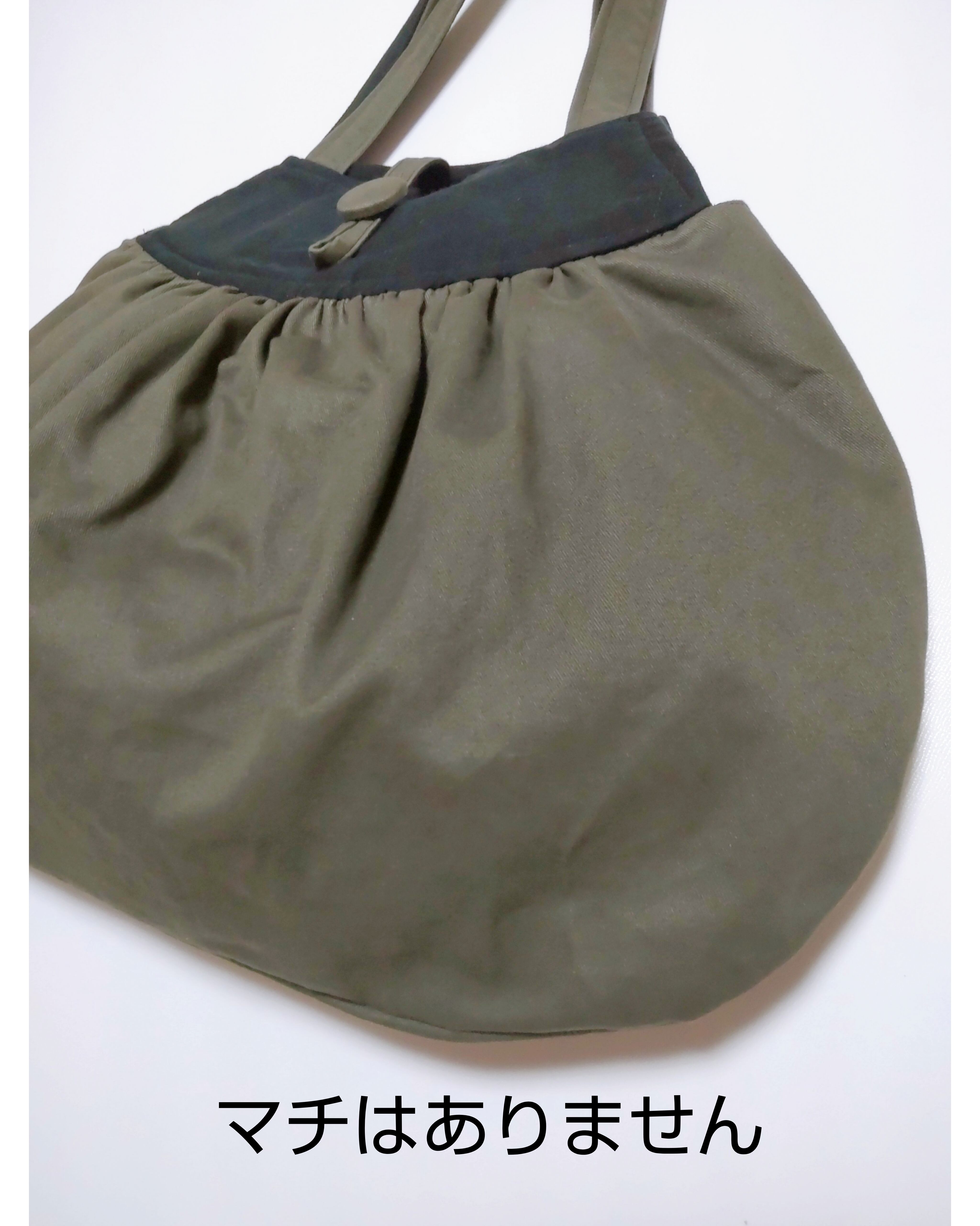 肩ひもはカーキの共布で作り、しっかりとした黒のバッグ用テープを縫い付けています。