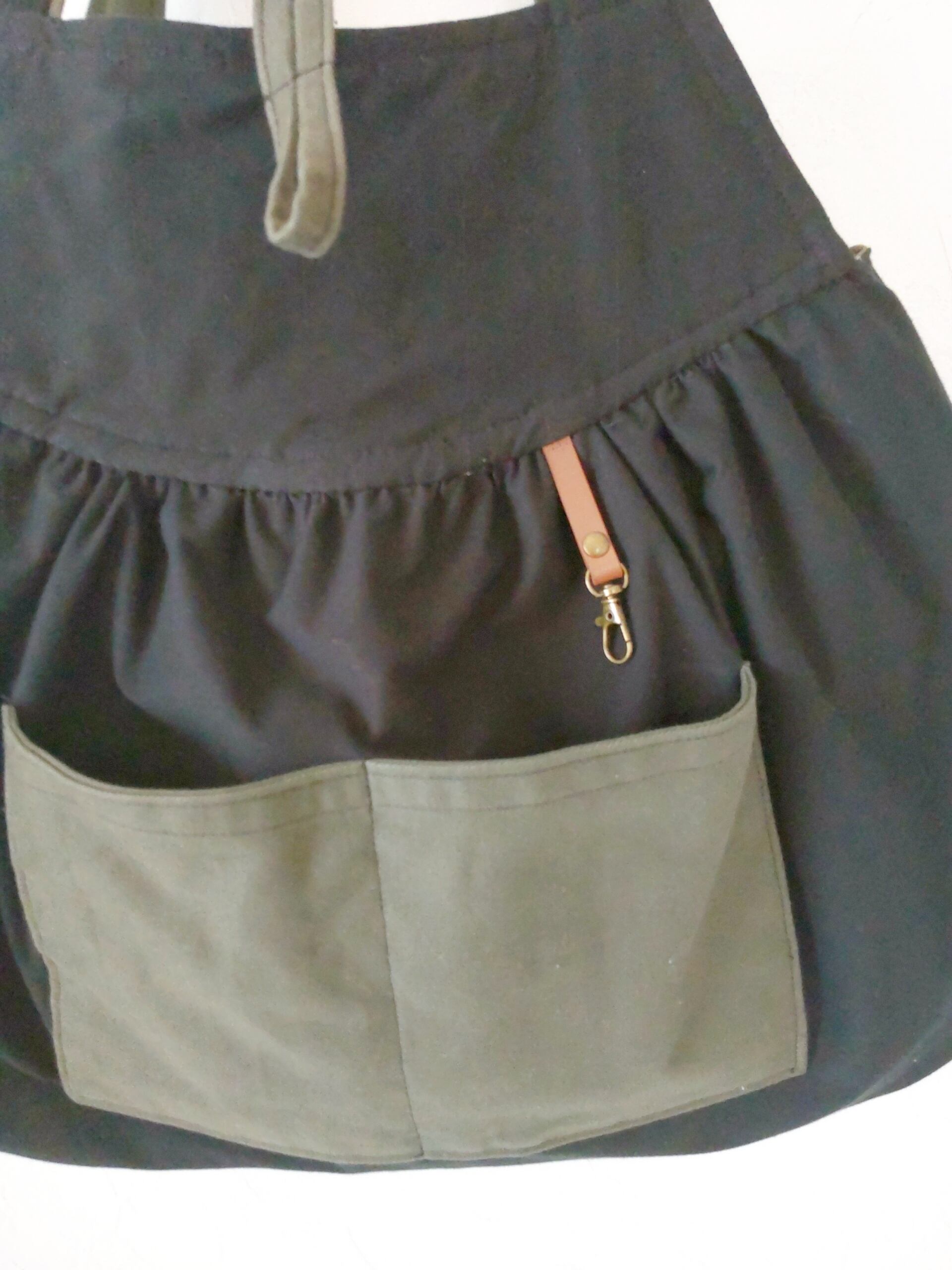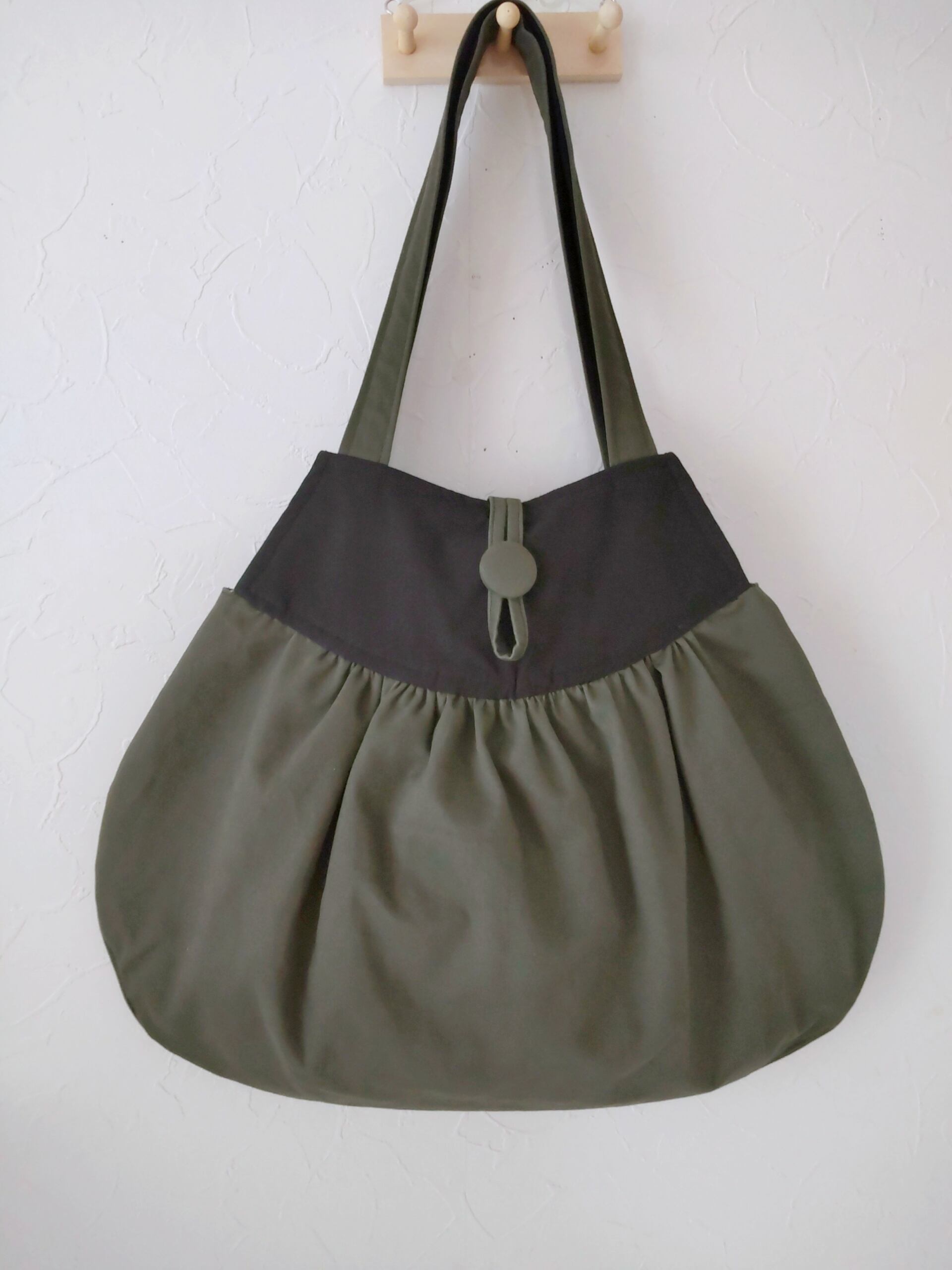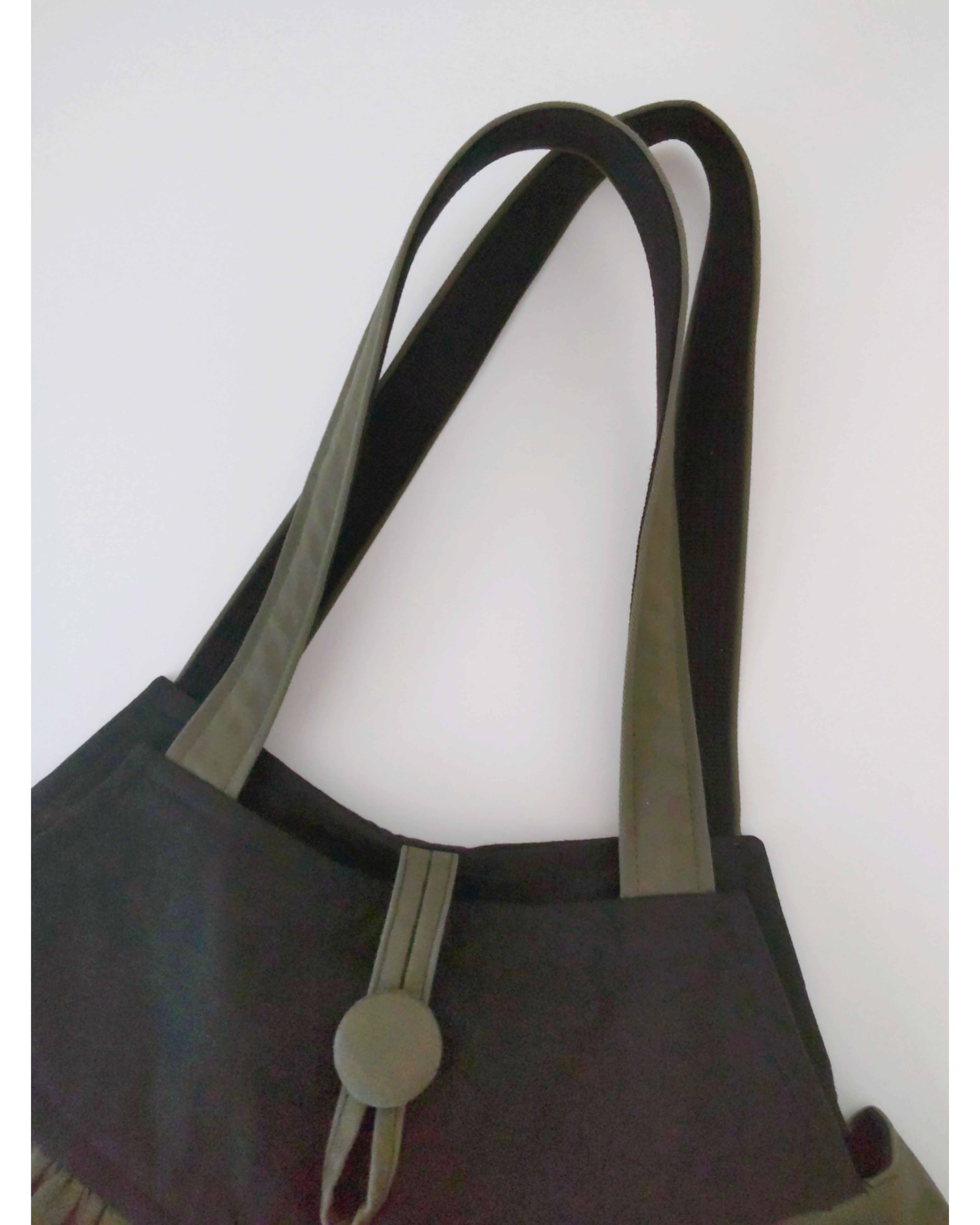 肩ひもはカーキの共布で作り、しっかりとした黒のバッグ用テープを縫い付けています。