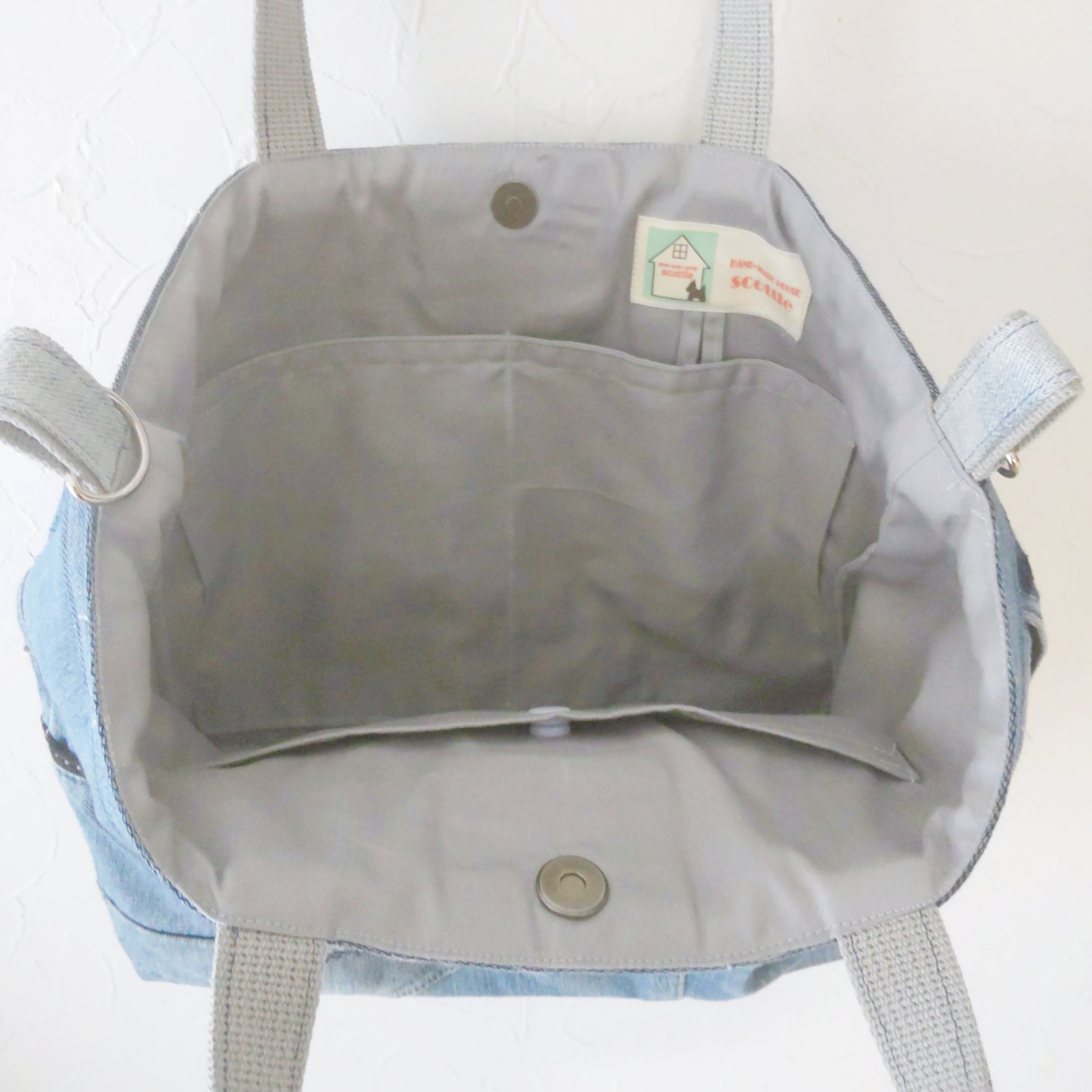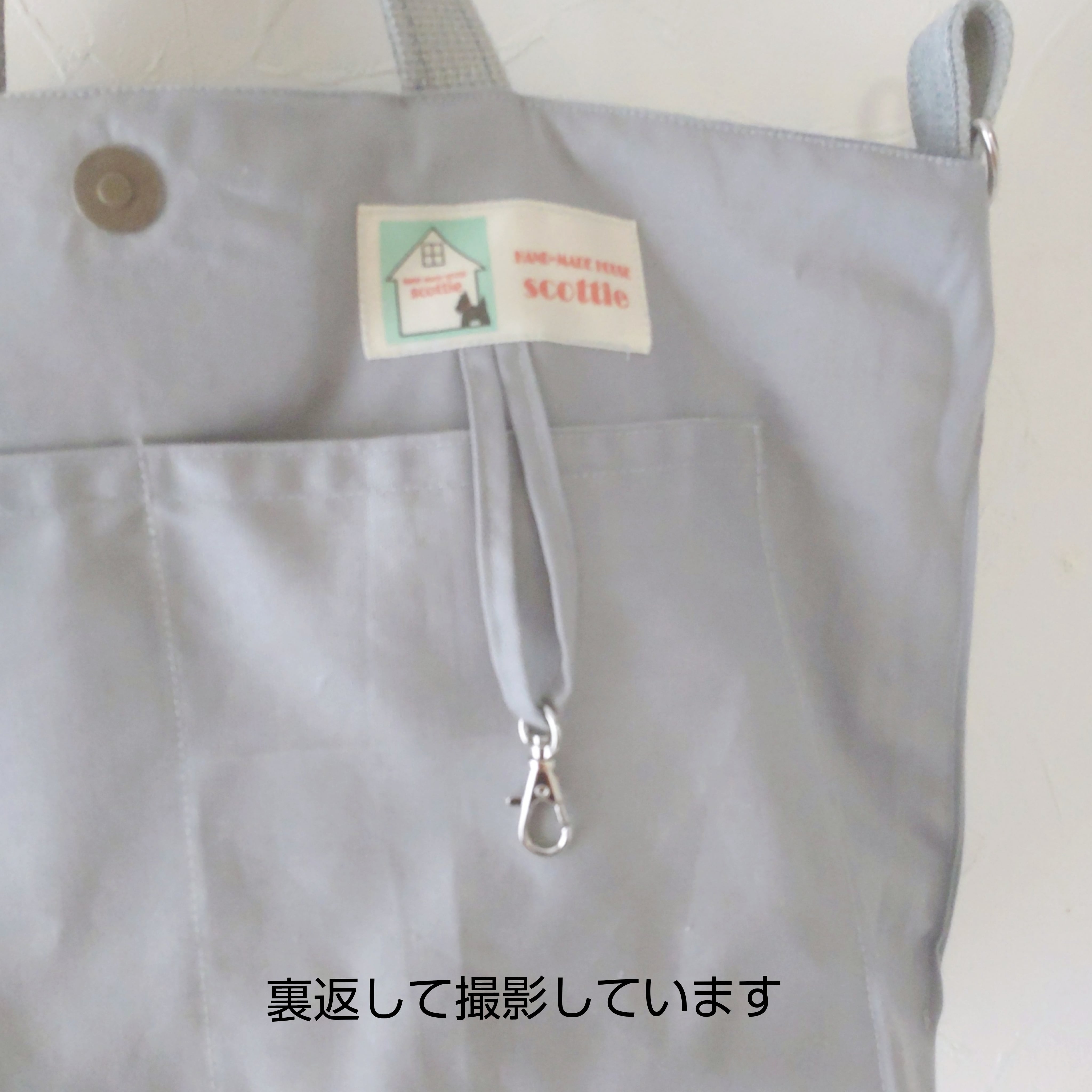 内布にはプラボタン付きの大きなポケットとキーフック付きポケットをつけました