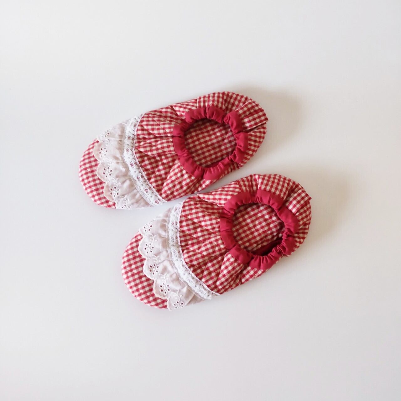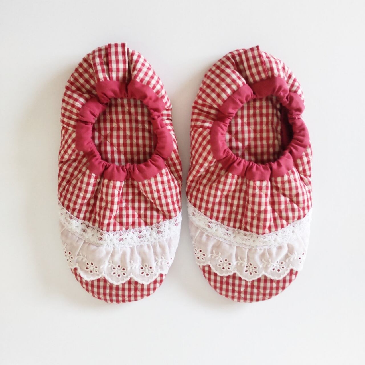 赤と白のギンガムチェックキルト地に、白のコットンレースをあしらったルームシューズです。